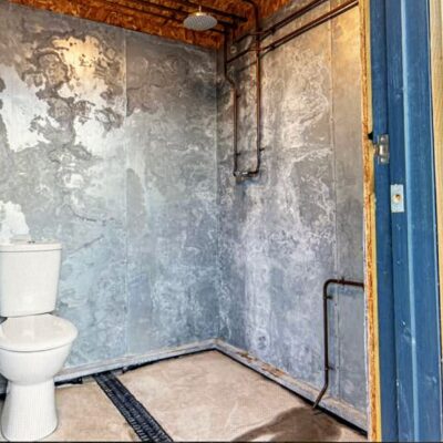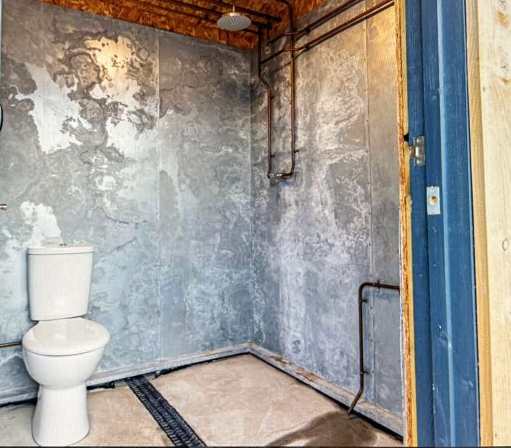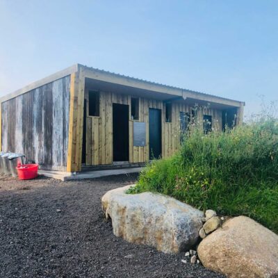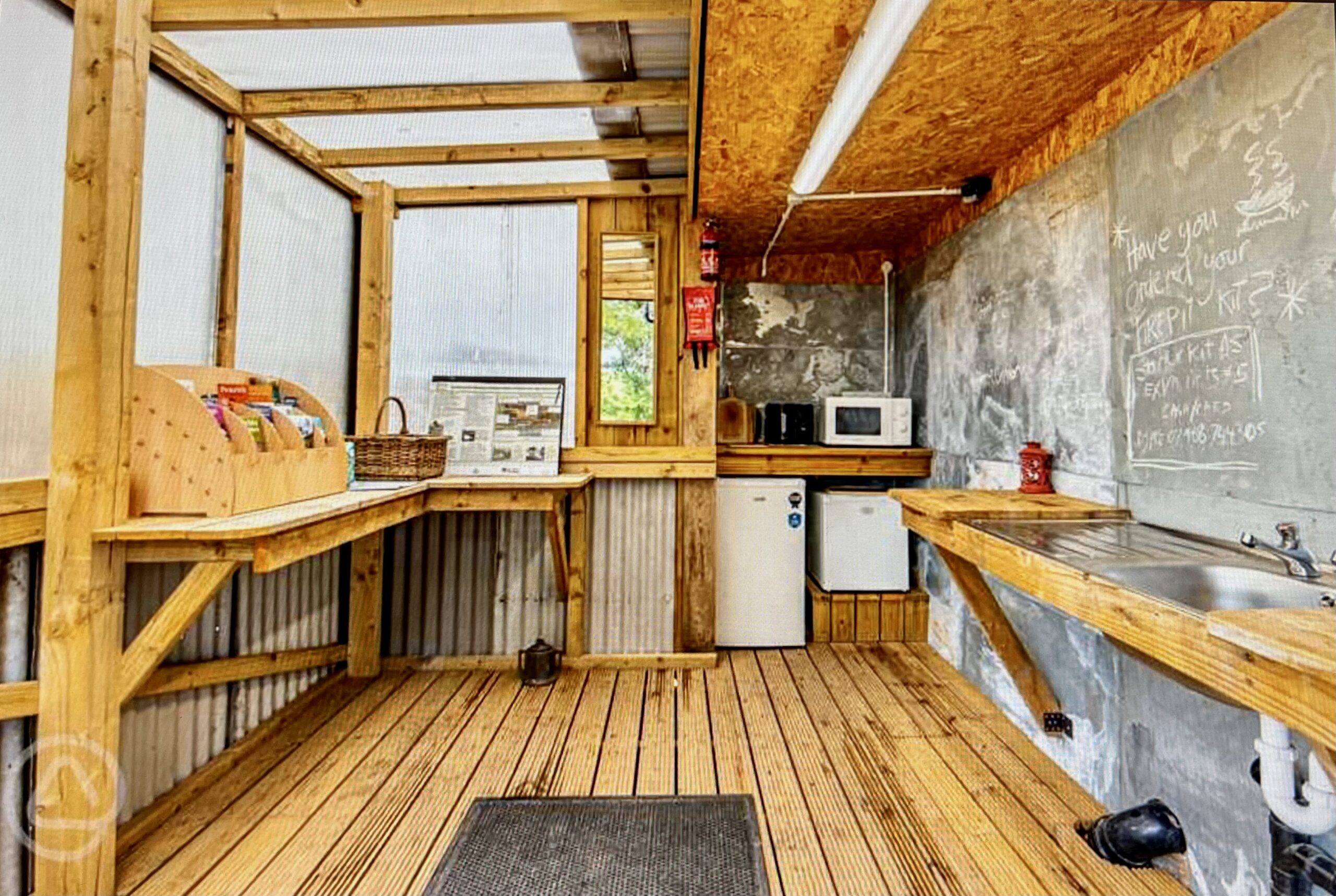 Gravel pitches….20 yards from the heated shower block and toilets. The kitchen area has washing up sink with hot and cold hot water, drinking water, microwave and fridge. This shower block is on grid
