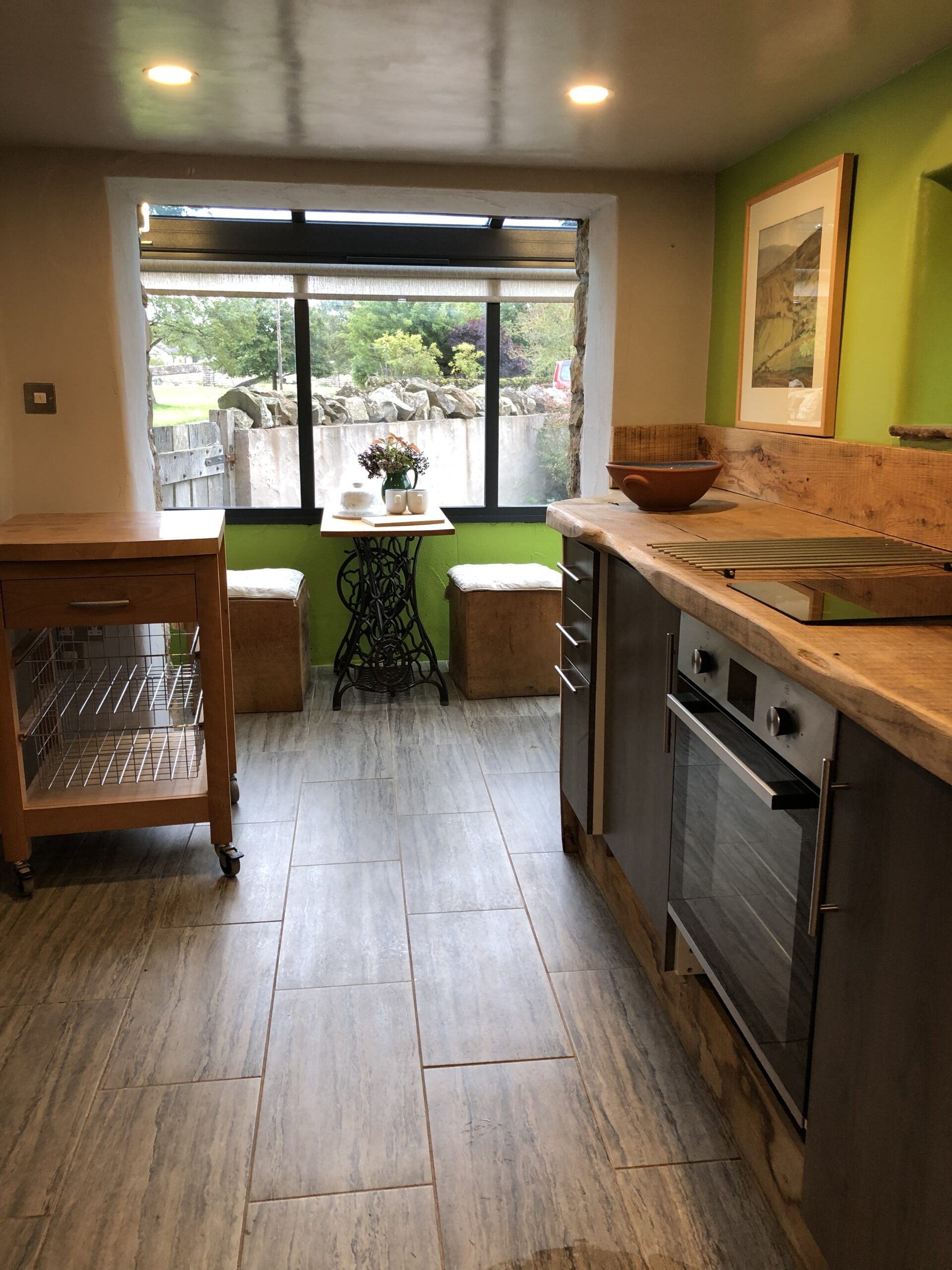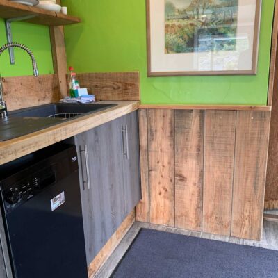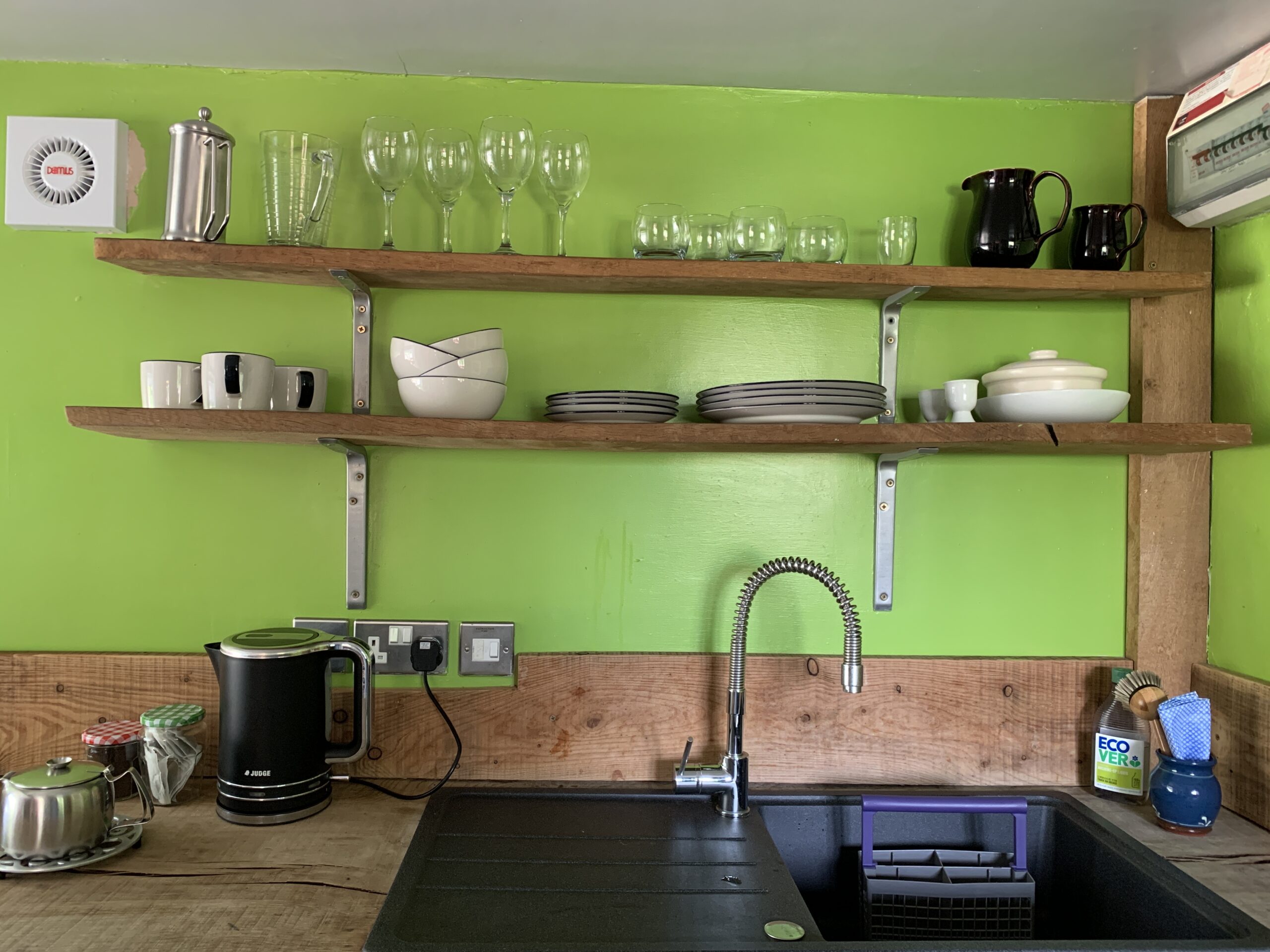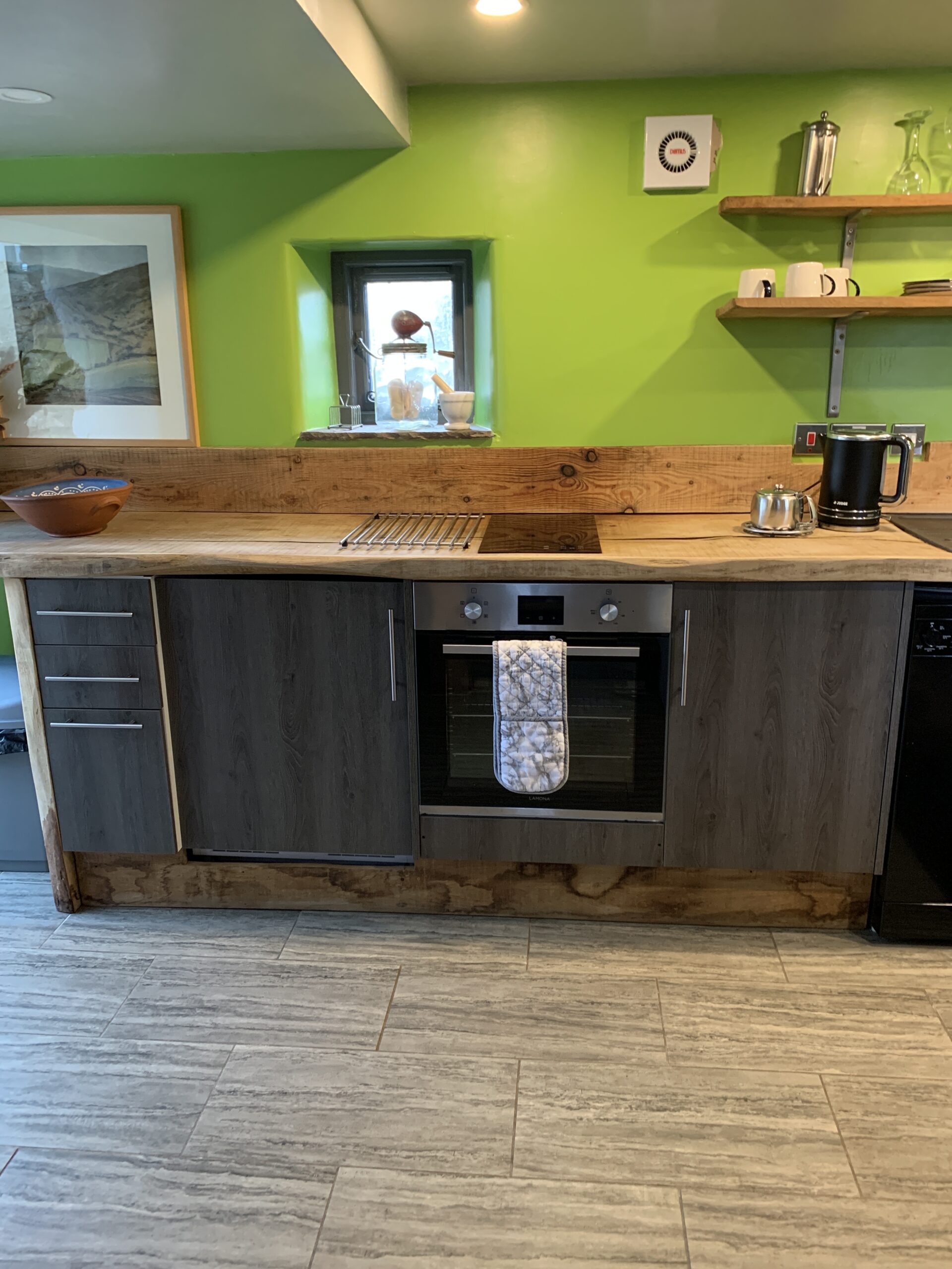 • The cottage has a small hand-built kitchen with plenty of worktop space. The solid oak top is crafted from one entire slice of a tree trunk. The oak was sourced from our farm at Crake Trees.