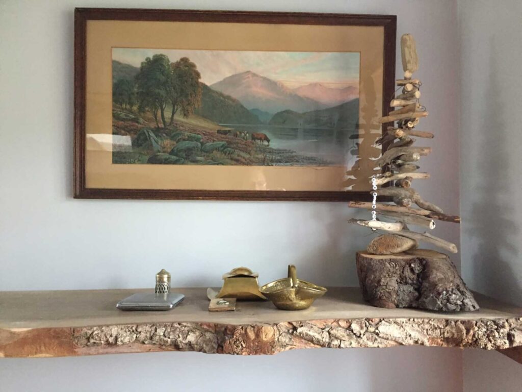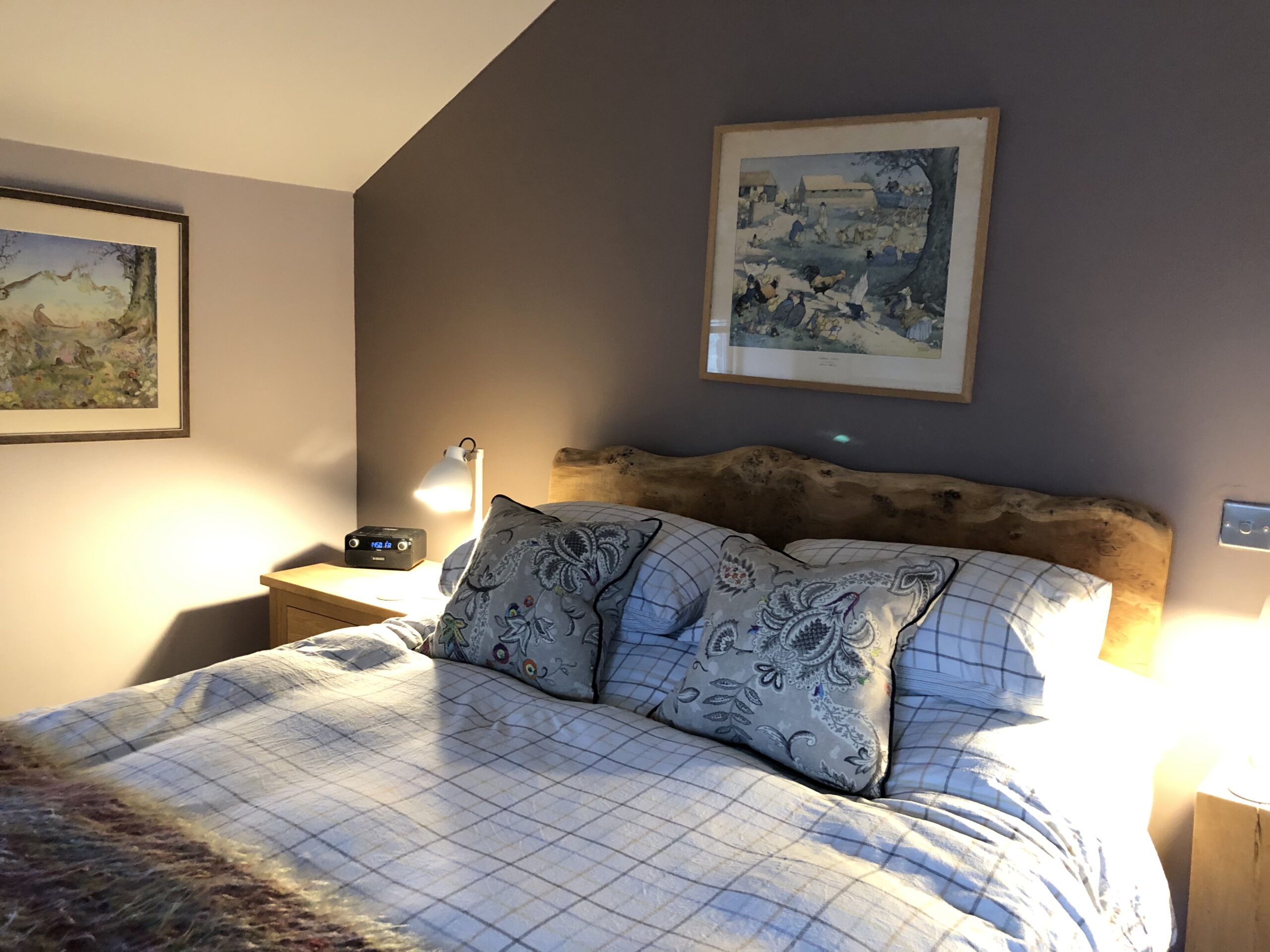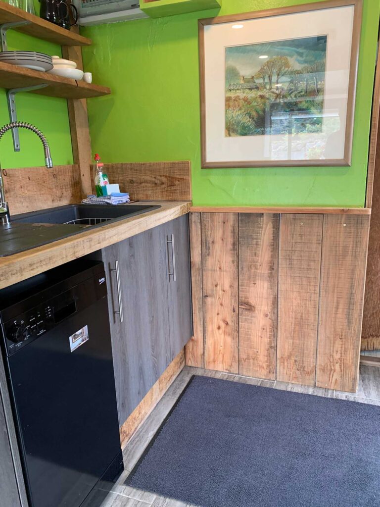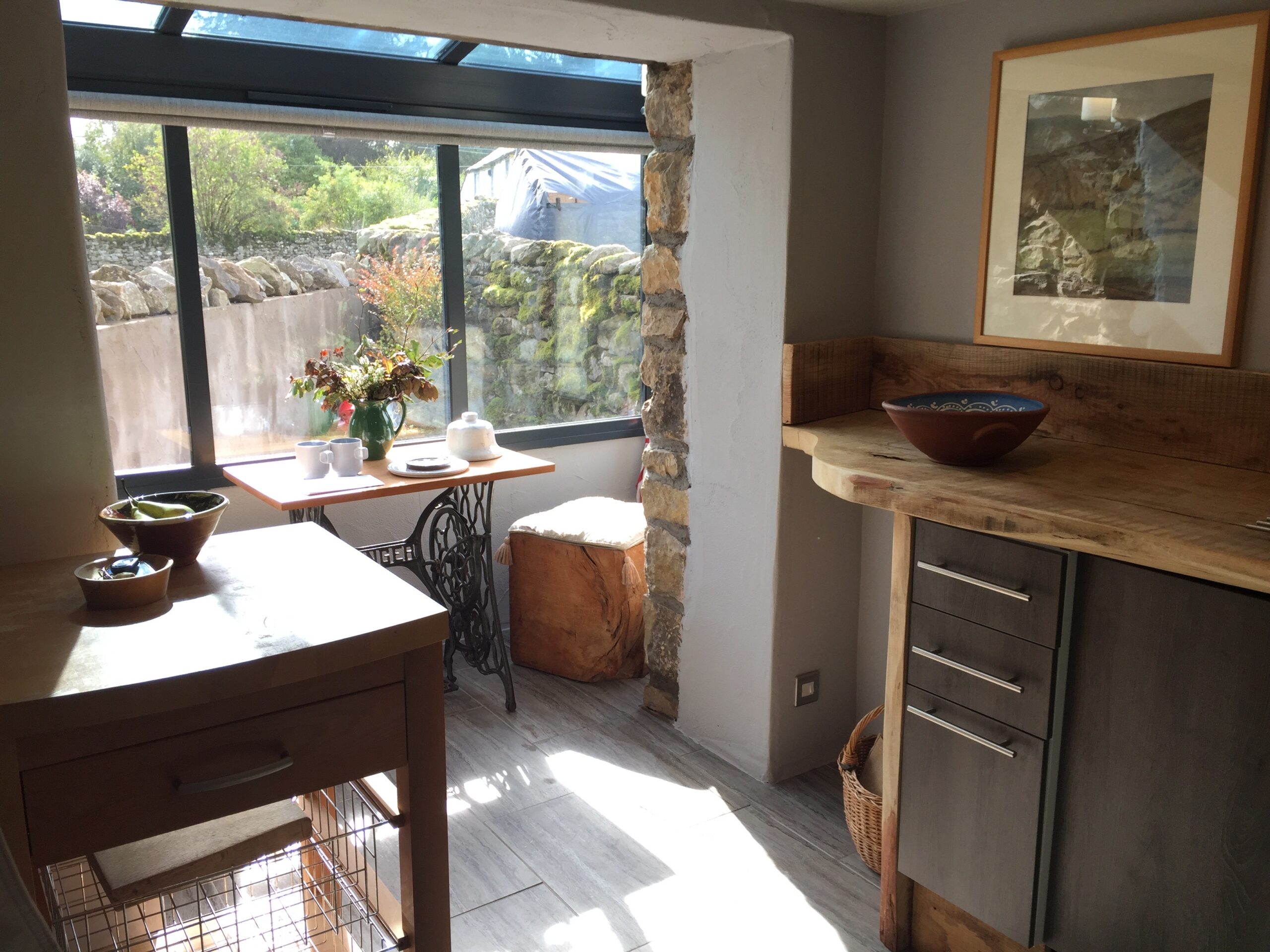 • The cottage has a small hand-built kitchen with plenty of worktop space. The solid oak top is crafted from one entire slice of a tree trunk. The oak was sourced from our farm at Crake Trees.