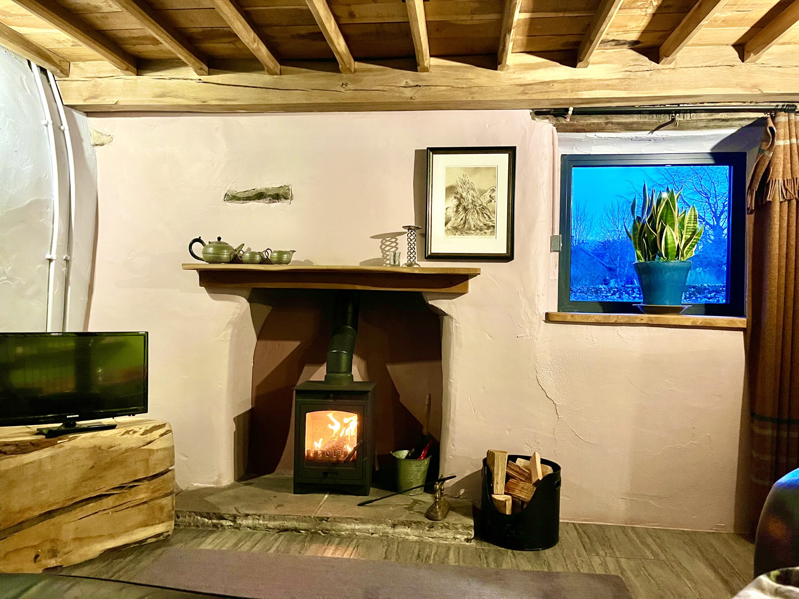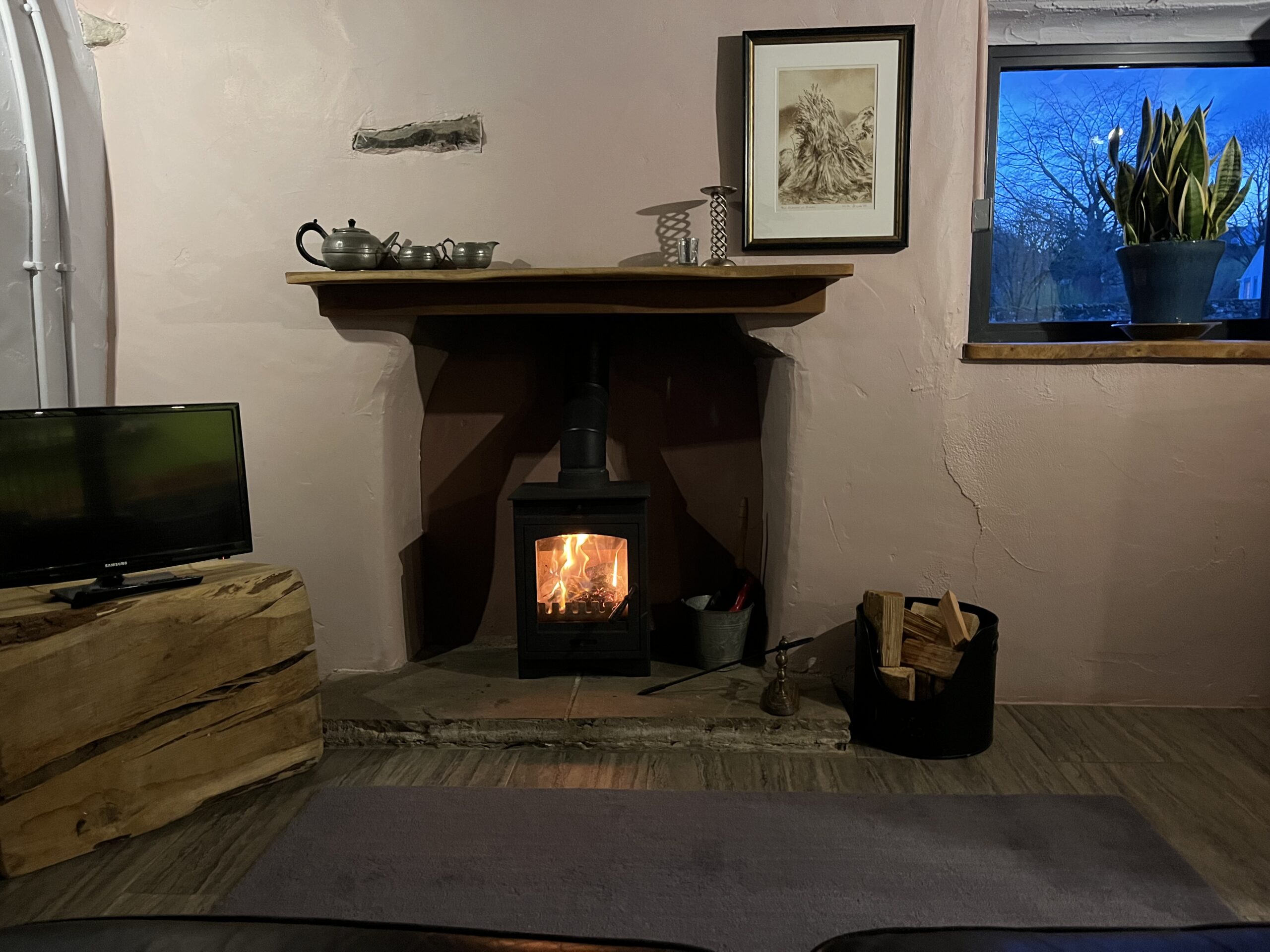 An electric storage radiator and two wall radiations in the conservatory. The wood stove is easy to light and is cosy to sit beside. Lighting the fire: